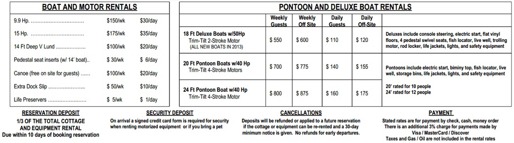 A fourteen foot Lund aluminum boat is furnished with each cottage. Deluxe fishing boat packages, a pontoon boat, motors, additional boats and canoes are available for rent. Licenses, bait, gasoline and oil can be purchased at the resort.